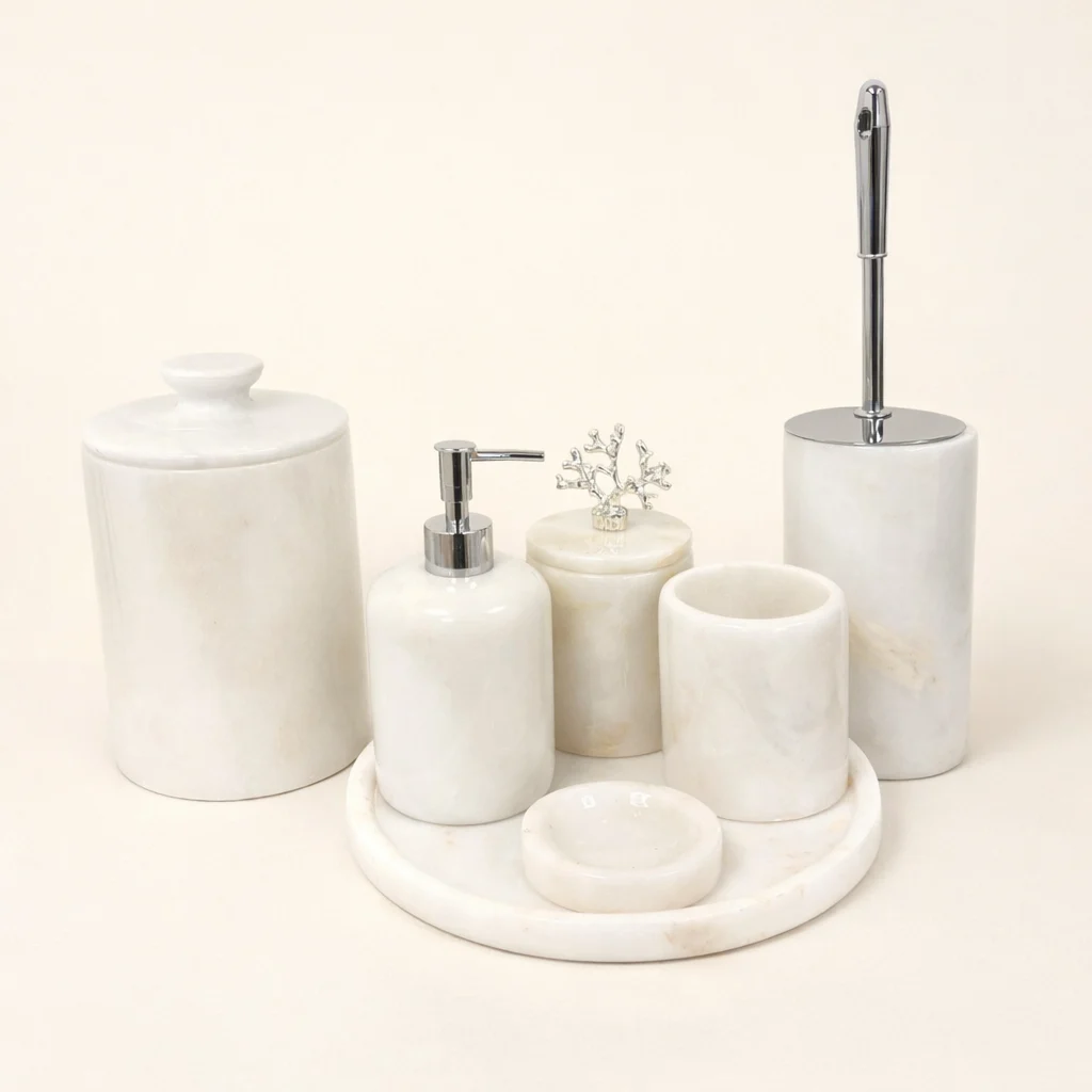 Marmer accessoires komen tot hun recht in verschillende ruimtes. In de woonkamer fungeren ze als visuele ankers op een tafel of dressoir. In de keuken worden ze gebruikt als schaal of dienblad, terwijl in de badkamer marmeren objecten zorgen voor rust en samenhang. Denk bijvoorbeeld aan een complete marmeren badkamerset of subtiele accenten naast de wastafel.