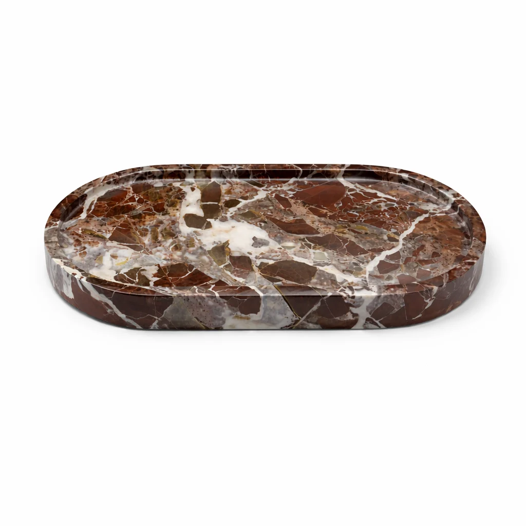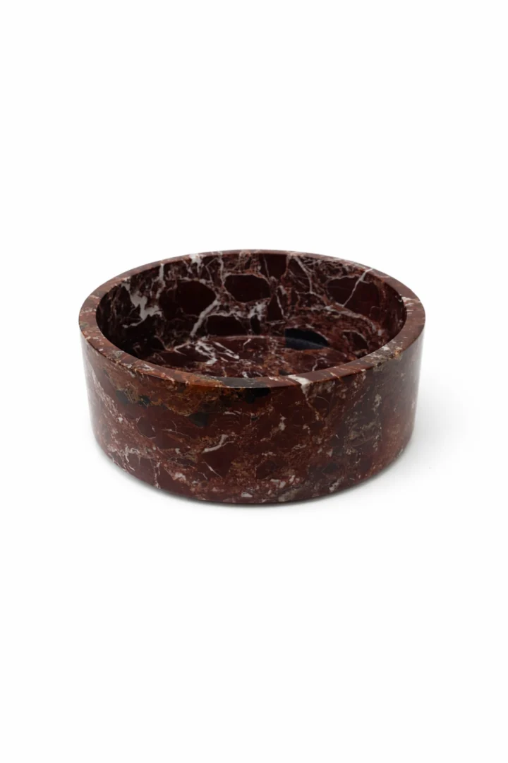 Bordeaux marmer kent variaties van diep rood tot warm roodbruin, vaak gecombineerd met lichte of donkere aders. Deze natuurlijke verschillen maken elk object onderscheidend. Bordeaux marmer combineert goed met materialen zoals hout, metaal en lichte steensoorten, waardoor het zich aanpast aan verschillende interieurstijlen.