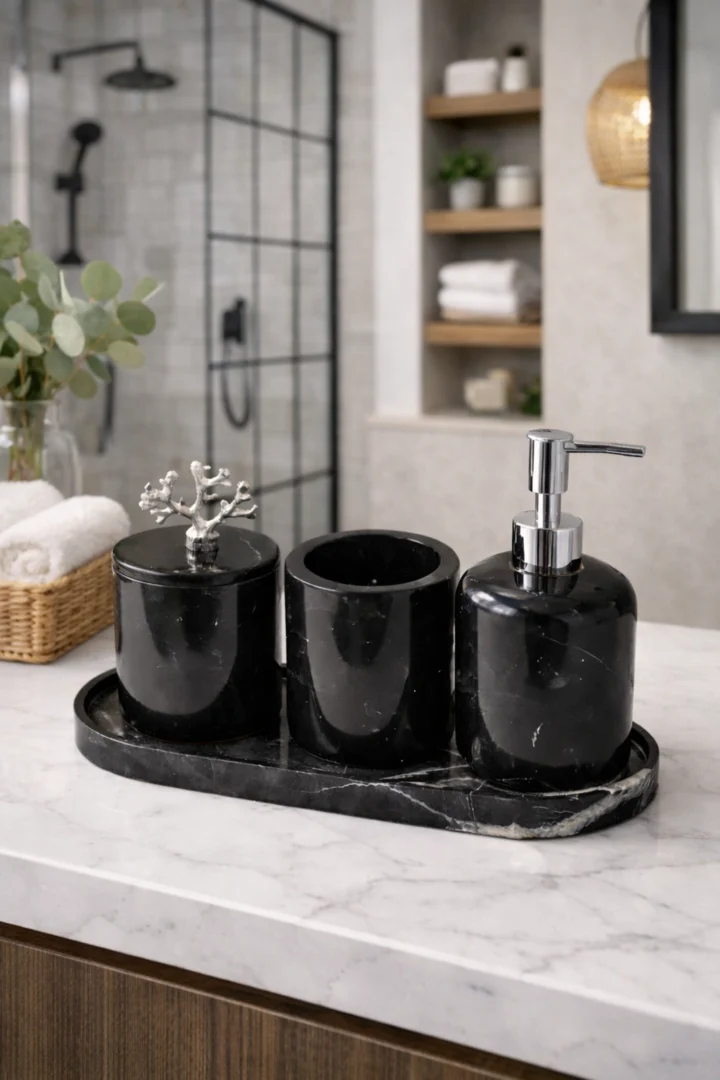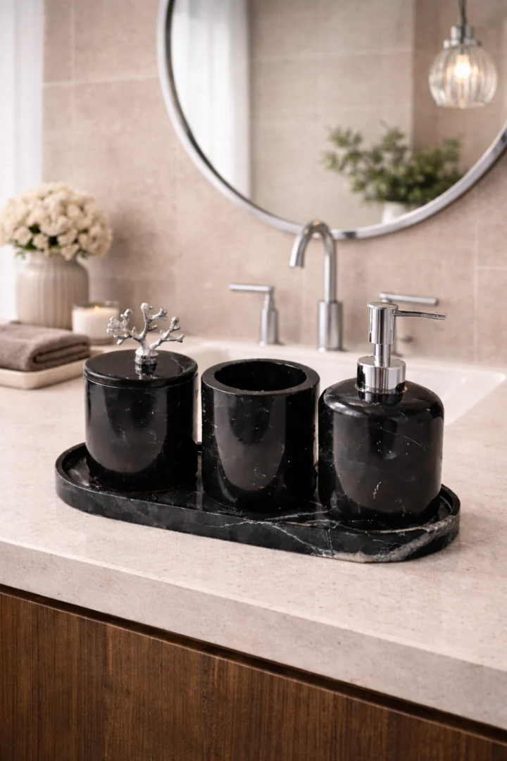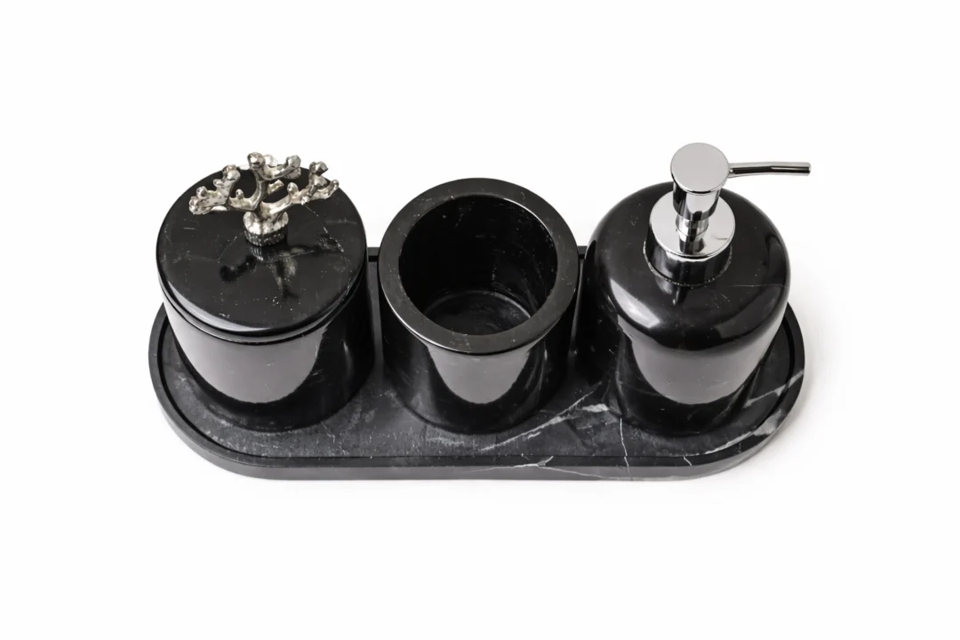 Breng luxe, rust en een hotelwaardige uitstraling in je badkamer met deze zwarte marmeren badkameraccessoires set. De set is vervaardigd uit hoogwaardig massief natuursteen en bestaat uit een stijlvolle tray, een zeepdispenser, een tandenborstelhouder en een opberg pot. De diepe zwarte kleur van het marmer, gecombineerd met subtiele natuurlijke aders, zorgt voor een tijdloze en elegante uitstraling.
