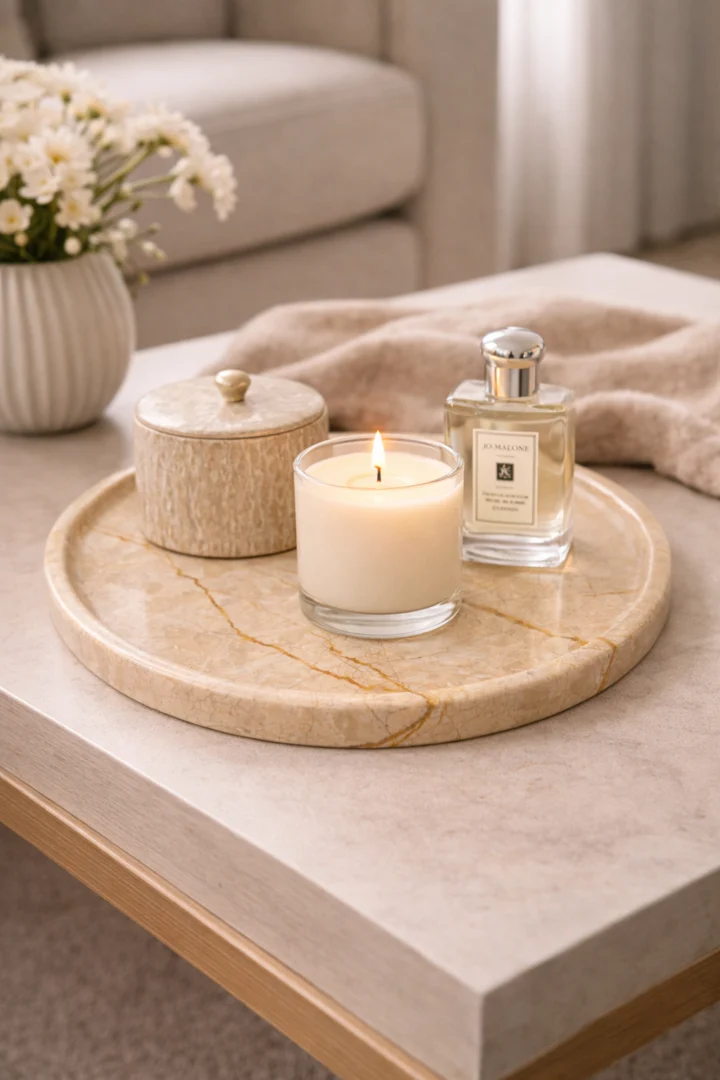 Het ronde ontwerp met subtiele opstaande rand maakt het dienblad zowel functioneel als decoratief. De gladde afwerking voelt verfijnd aan en benadrukt de luxe kwaliteit van het natuursteen. Hierdoor komt het dienblad prachtig tot zijn recht in diverse interieurstijlen, van modern en minimalistisch tot warm en klassiek.