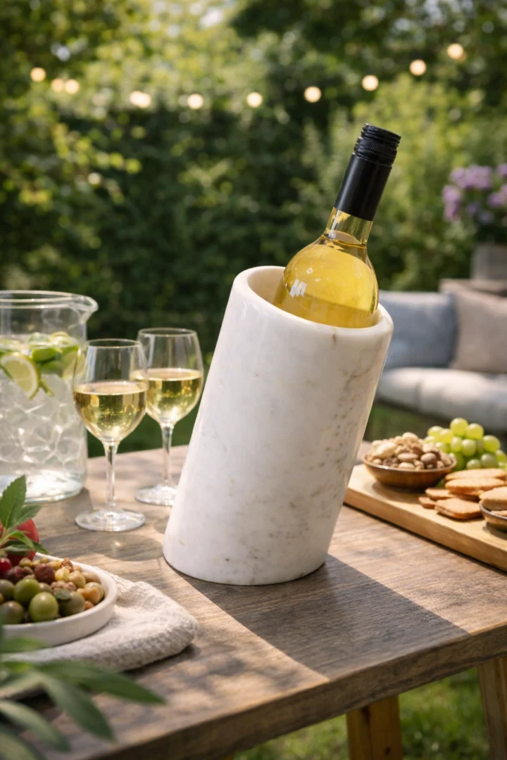Dankzij de natuurlijke eigenschappen van marmer blijft de fles wijn langer koel, zonder gebruik van ijs of andere hulpmiddelen. Het marmer absorbeert en behoudt de temperatuur, waardoor zowel witte als rode wijn op ideale drinktemperatuur blijven. Dit maakt de wijnkoeler niet alleen esthetisch aantrekkelijk, maar ook bijzonder functioneel.