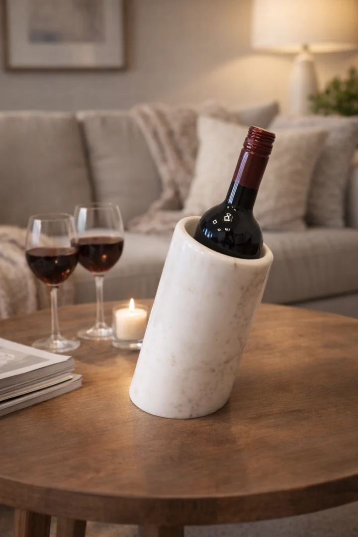 Deze exclusieve wijnkoeler van massief wit natuurmarmer is ontworpen voor liefhebbers van verfijnd design en stijlvolle momenten. Het minimalistische, schuine silhouet geeft de wijnkoeler een moderne en elegante uitstraling, terwijl het zware marmer zorgt voor stabiliteit en een luxueus gevoel.