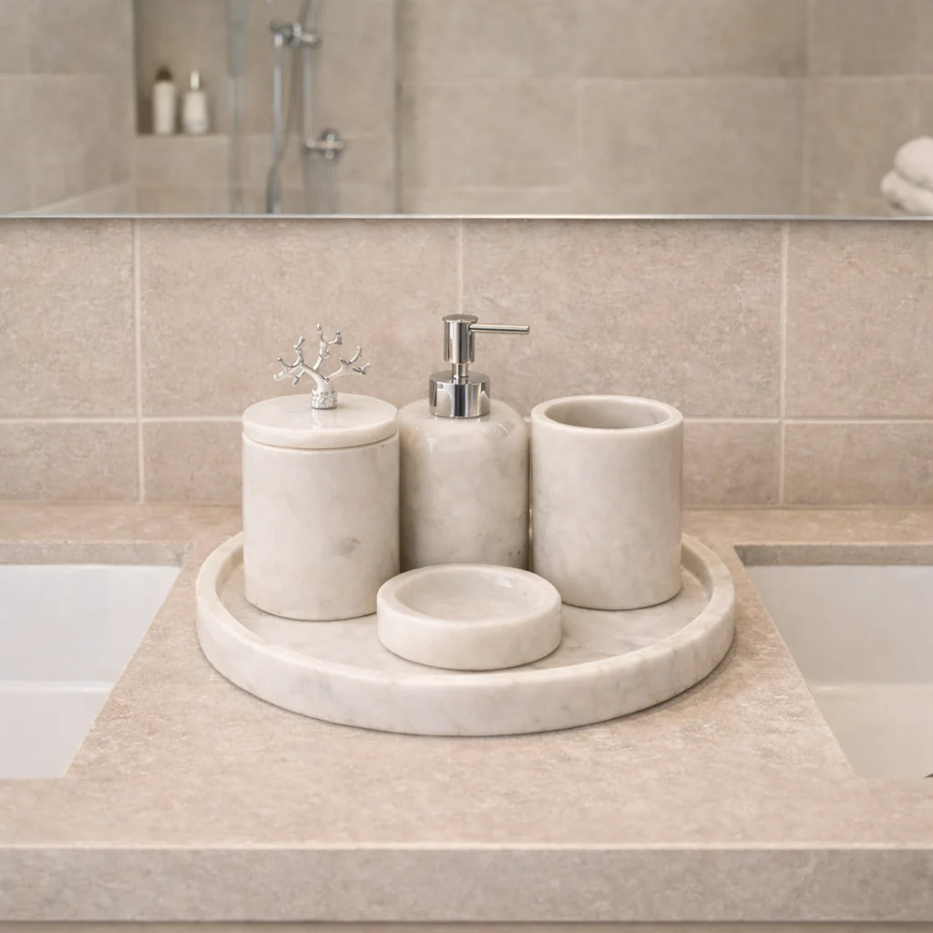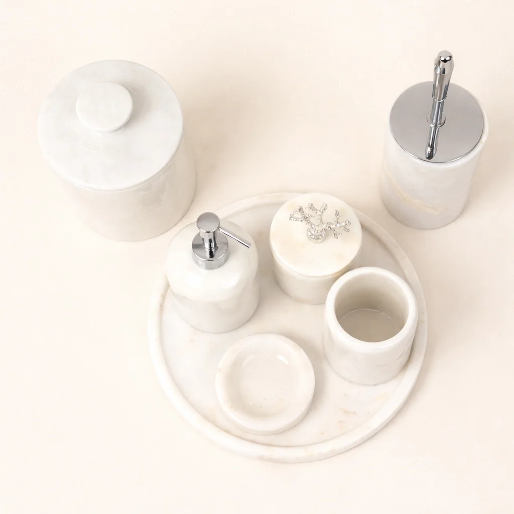 De set is zorgvuldig samengesteld om zowel praktisch als esthetisch te zijn: van stijlvolle opbergpotten tot functionele dispensers en accessoires die dagelijks gebruik combineren met een luxe hotelgevoel. Dankzij het stevige marmer voelt elk item robuust en kwalitatief aan, terwijl het neutrale kleurenpalet moeiteloos past in zowel moderne als klassieke badkamers. Een ideale keuze voor wie op zoek is naar een duurzame, stijlvolle en complete badkameroplossing met een premium uitstraling.