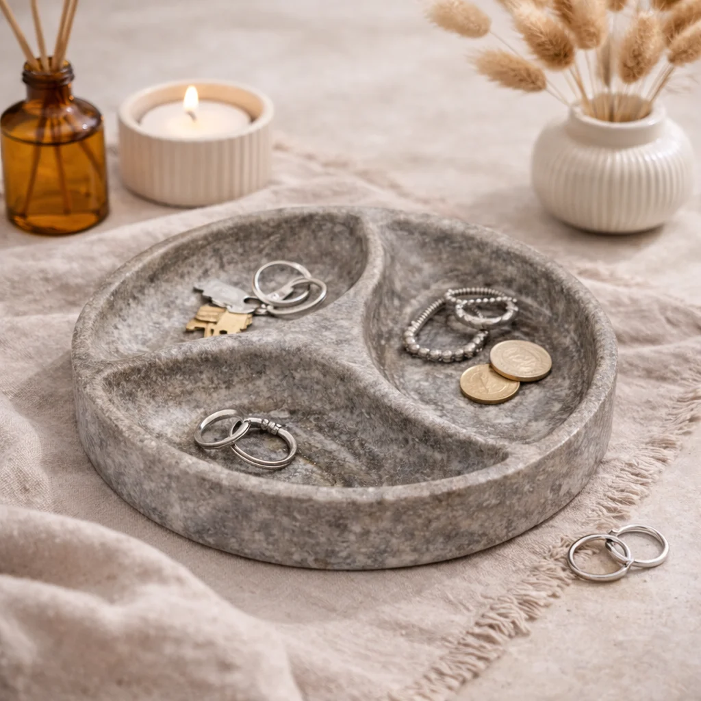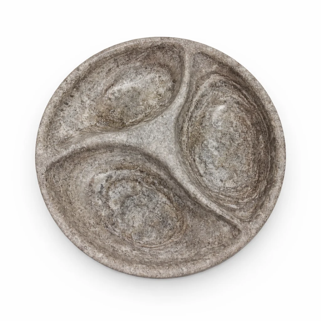 Breng luxe en rust samen op tafel met deze ronde marmeren serveerschaal met drie vakken. Gemaakt van hoogwaardig natuurmarmer in een elegante grijstint, straalt deze schaal pure verfijning uit. De natuurlijke patronen en kleurnuances zorgen ervoor dat elk exemplaar uniek is.