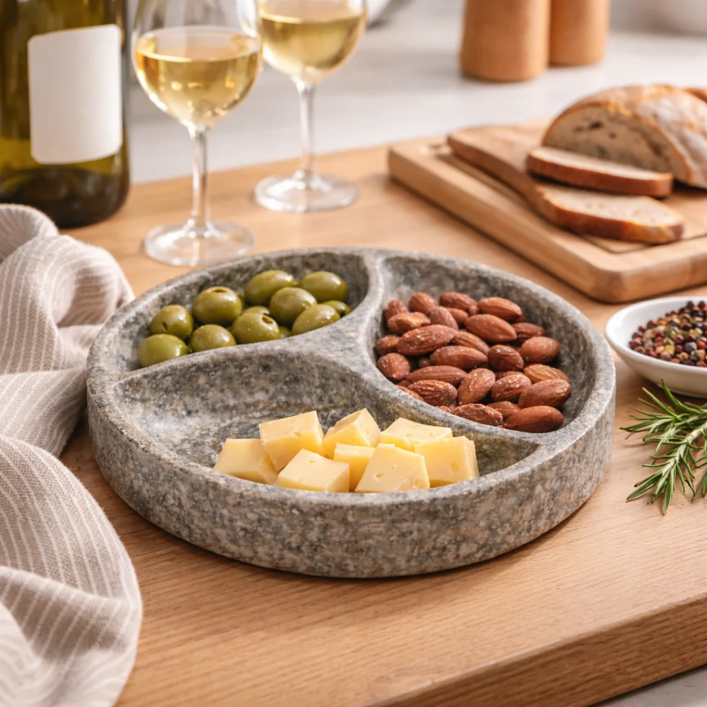 Dankzij het slimme ontwerp met drie afzonderlijke vakken is de schaal perfect voor het serveren van tapas, noten, olijven, dips of kleine hapjes, zonder smaken te mengen. Niet in gebruik? Dan fungeert deze schaal moeiteloos als decoratief object op een tafel, dressoir of keukenblad.