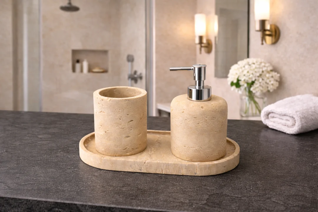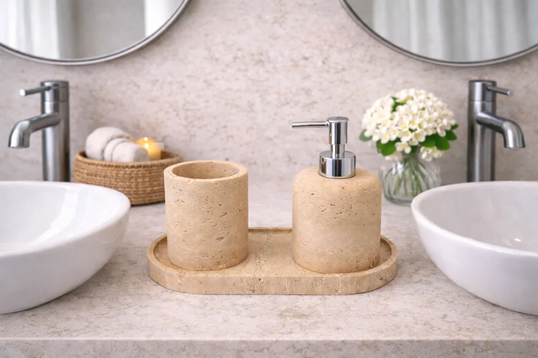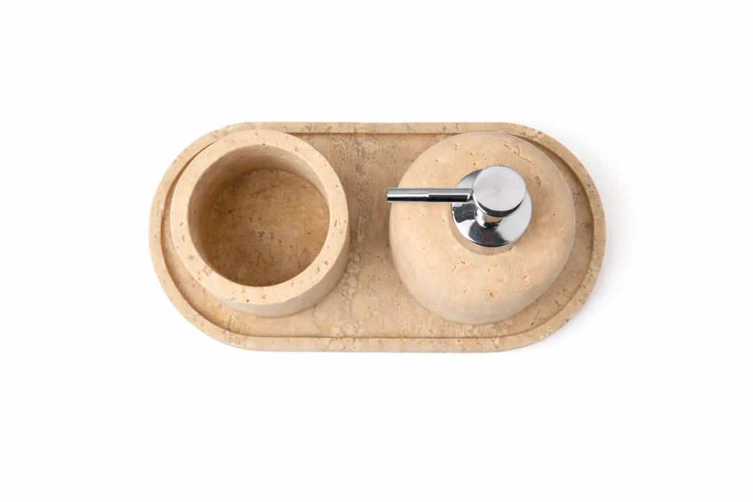 De travertin tray vormt een stevige en decoratieve basis waarop alle accessoires netjes en overzichtelijk bij elkaar blijven. Ideaal voor het organiseren van zeep en tandenborstels, terwijl je wastafel een opgeruimde en stijlvolle uitstraling behoudt. Door het gebruik van zwaar natuursteen staat de set stabiel en is deze geschikt voor dagelijks gebruik.