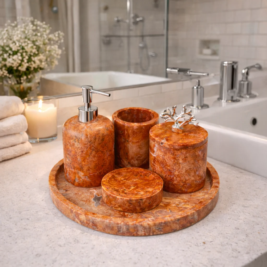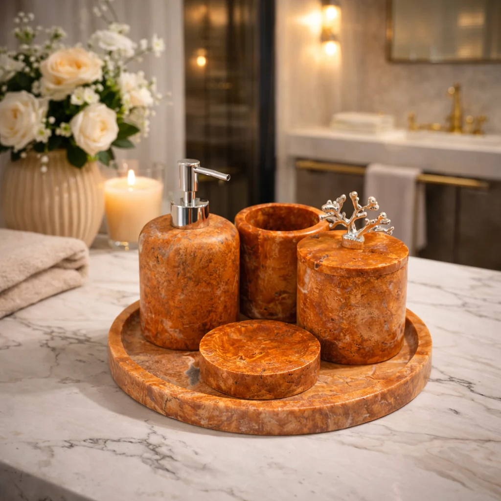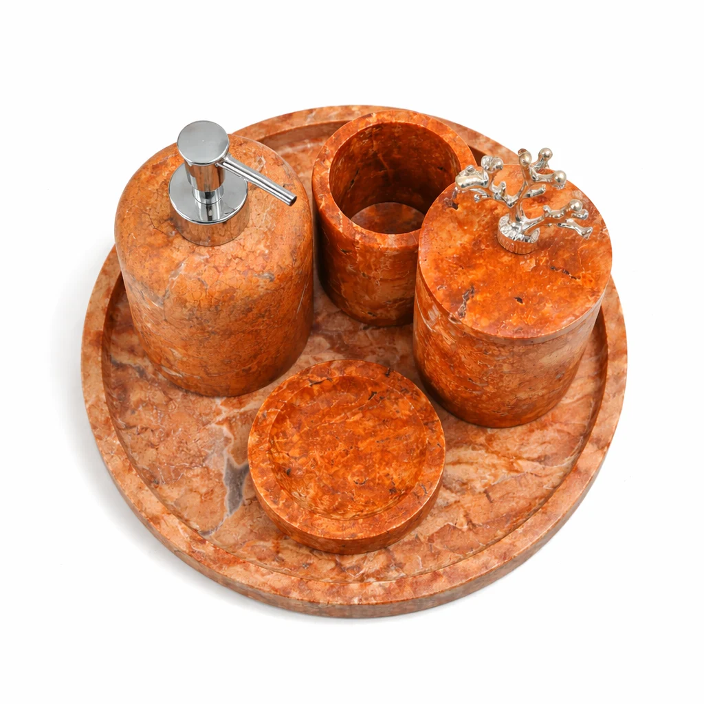 Deze luxe badkamerset van roodbruin natuurmarmer is een echte eyecatcher die direct warmte, karakter en exclusiviteit toevoegt aan elke badkamer. De set is volledig vervaardigd uit massief natuurmarmer, waardoor elk stuk uniek is door de natuurlijke adering, kleurschakeringen en structuur van het steen. De set bestaat uit een elegante zeeppomp met chrome pomp, een beker, een opbergpot met decoratieve chrome koraalknop, een zeepbakje en een bijpassend rond marmeren dienblad voor een stijlvolle en georganiseerde uitstraling.