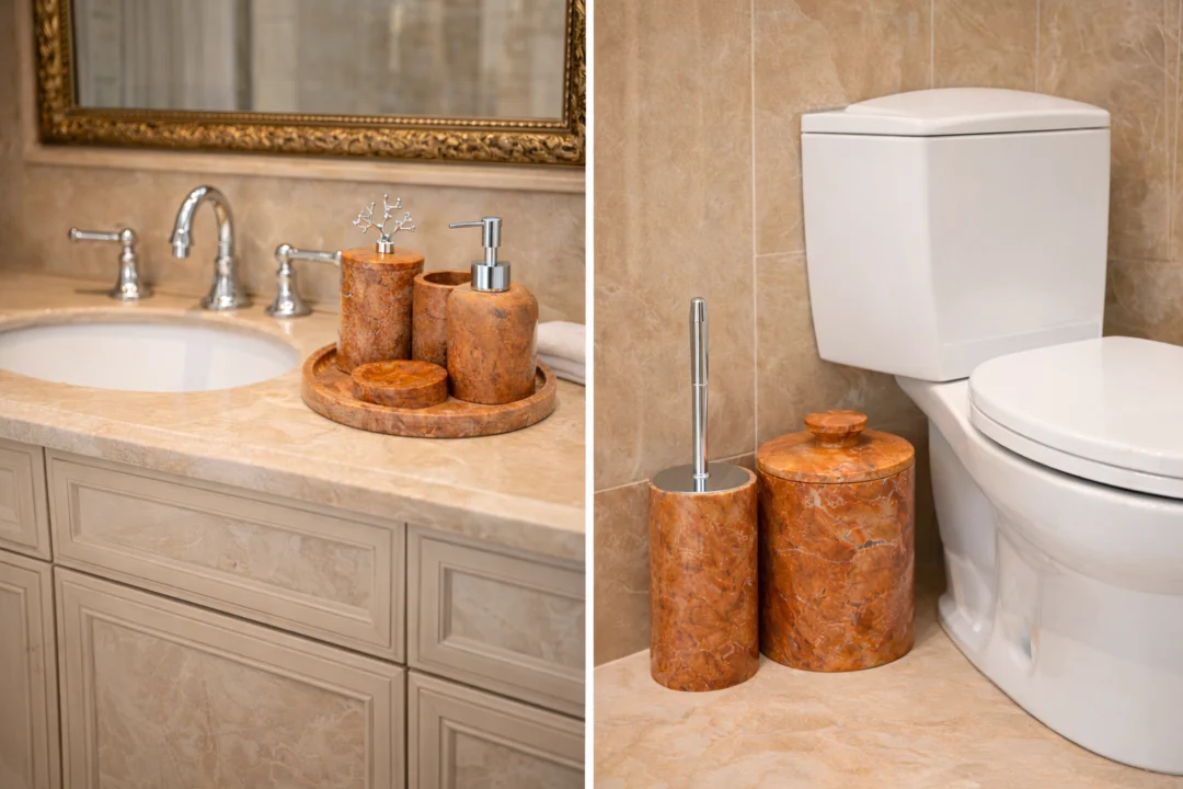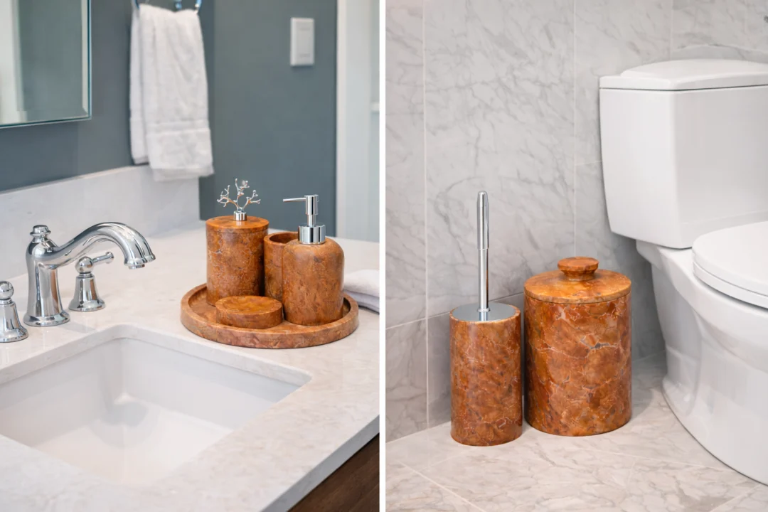 Deze luxe marmeren badkamerset is speciaal ontworpen om zowel de wastafel als de toiletruimte stijlvol en praktisch in te richten. De set combineert hoogwaardige accessoires voor dagelijks gebruik, zoals een zeepdispenser, beker en schaaltje op een bijpassend dienblad, met een robuuste wc-borstelhouder en een ruime opbergpot voor toiletrollen of afval. Dankzij het gebruik van massief natuurmarmer is elk item uniek en straalt de set kwaliteit en exclusiviteit uit.