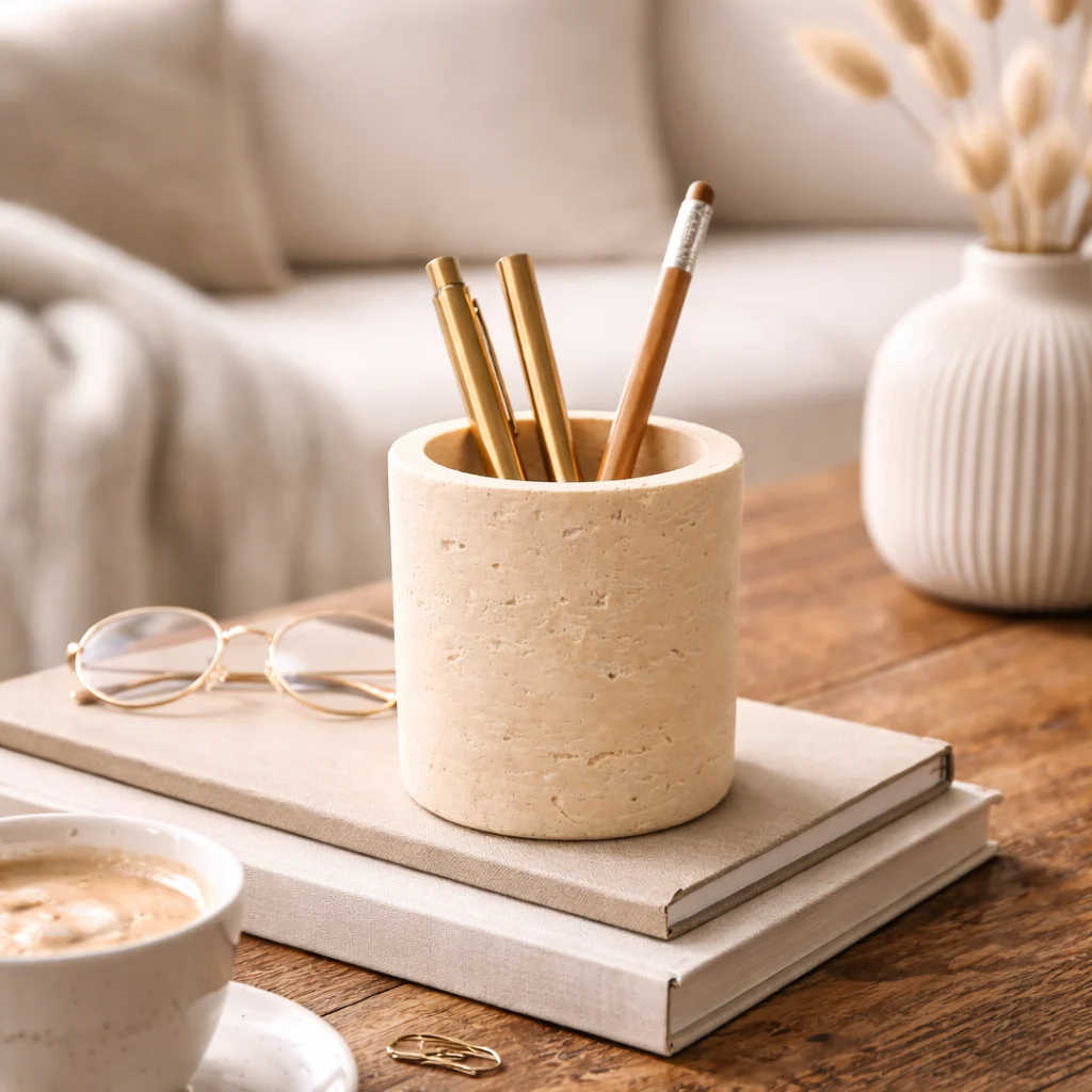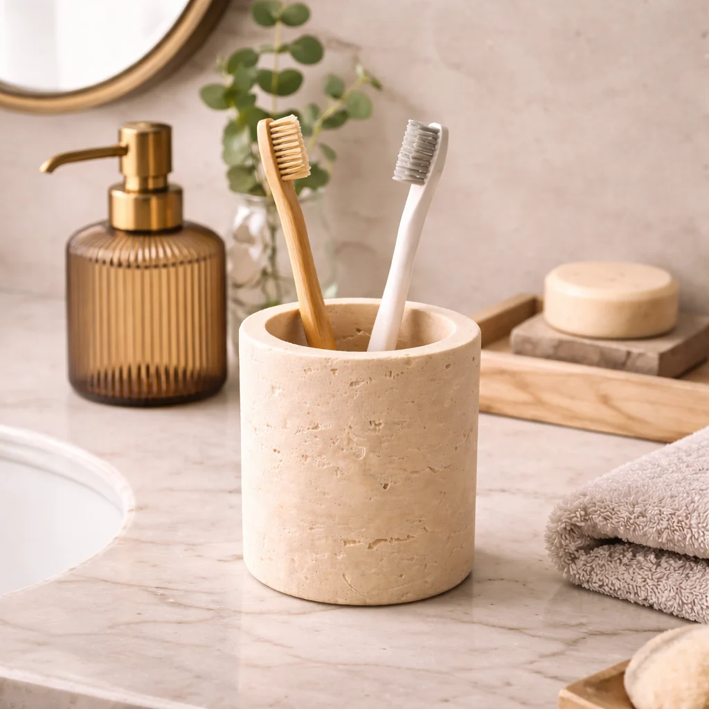 De houder is multifunctioneel inzetbaar: gebruik hem als luxe tandenborstelhouder in de badkamer, als organizer voor make-upkwasten of als stijlvolle opberger voor keukengerei. Het minimalistische cilindrische ontwerp past perfect binnen moderne, Scandinavische en hotel-chique interieurs. Door het solide gewicht staat de houder stabiel en voelt hij hoogwaardig aan.