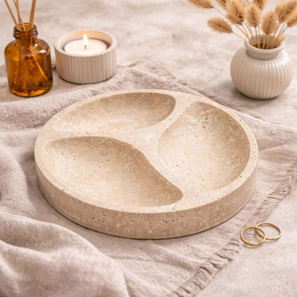 Het praktische ontwerp met drie afzonderlijke vakken maakt deze schaal ideaal voor het serveren van tapas, noten, olijven, dips of kleine hapjes, zonder dat smaken zich mengen. Of je haar nu gebruikt tijdens een gezellige borrel of als decoratief object in je interieur, deze travertin schaal voegt moeiteloos stijl en luxe toe aan elke setting.