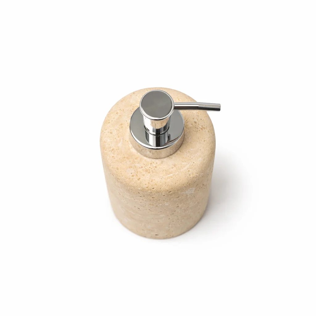 Deze zeepdispenser is vervaardigd uit massief beige travertin en straalt natuurlijke luxe en eenvoud uit. De kenmerkende poriën en subtiele kleurnuances van het natuursteen zorgen ervoor dat elke dispenser uniek is. Dankzij het solide gewicht staat hij stevig op zijn plek en voelt hij direct hoogwaardig aan.